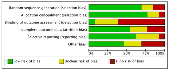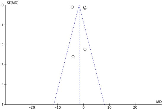 The risk of bias assessment was performed by two authors (L.S. and F.M.) independently. Any disagreement was settled by a third author (N.M.). The risk of bias graph of the Review Manager Software 5.3 (The Nordic Cochrane Collaboration, Copenhagen, Denmark) was used to assess the risk of bias in the individual studies. The following biases were analyzed: selection, detection, reporting, attrition, and other sources of bias. A funnel plot of the most commonly reported outcome was used to assess the risk of publication bias. Plot asymmetries relate proportionally to the risk of publication bias.