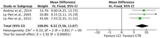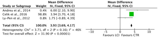 NpVAS (MD 8.32; 95%CI 5.56, 11.07; p < 0.0001, Figure 4) and pVAS (MD 3.93; 95%CI 3.69, 4.17; p < 0.0001, Figure 5) were greater in the LSIs cohort.