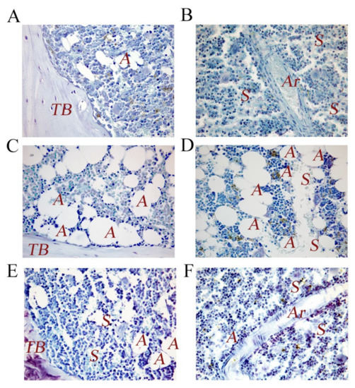 Representative images of femur bone marrow (sub-metaphyseal area) from WT and p62−/− 6-month-old mice stained with toluidine bleu. (A) Bone marrow from WT mice. Note the different hematopoietic and stromal cell populations partakes in endosteal niche and the anatomical and structural cohesion and expansion of these bone marrow inhabitants. (B) Bone marrow from WT mice. Bone marrow elements surround arterioles and sinusoids to form the perivascular niche. Note the levels of hematopoietic and mesenchymal sub-populations, which reside next to the vessels. (C) Bone marrow from mice p62−/−. Note adipocytes infiltration and endosteal niche or (D) perivascular niche disruption. (E,F) Bone marrow from p62−/− mice treated with p62DNA plasmid as previously described [11]. Note the decreased fat cells number and the tendency to stabilize a steady state bone marrow phenotype. TB: trabecular bone; A: adipocyte; Ar: arteriole; S: sinusoids. Magnification, ×40.