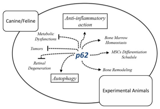 In recent years, the most unexpected discovery concerning p62 tasks on cells homeostasis might be the ability of this protein to recruit a wide range of anti-inflammatory cytokine and chemokines for quenching the “slow burn” and (at least partially) to reverse the chronic inflammation [8,13,14,15]. Taking into consideration the various forms of inflammation-based diseases in small animals affecting muscle-skeletal apparatus such as feline poliomyelitis and discospondylitis [16], myopathies, osteochondrosis dissecans and osteopathies in horses and dogs [17,18], but also cutaneous diseases (i.e., canine sterile granulomatous dermatitis) and intestinal T cell lymphoma [17], the development of new and efficient anti-inflammatory drugs becomes a critical knot to untie for field researchers. In context, the p62 functional dimension can lay the groundwork for building an effective platform against inflammation by taking advantage of the multitask intracellular p62 features to improve specific homeostatic tasks in several tissues. Henceforward, we provide an up-to-date analysis of the “handy-protein” p62 within a steady state or in a pathological scenario.