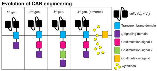 - Chmielewski, M.; Abken, H. TRUCKs: The fourth generation of CARs. Expert Opin. Biol. Ther. 2015, 15, 1145–1154. [Google Scholar] [CrossRef]