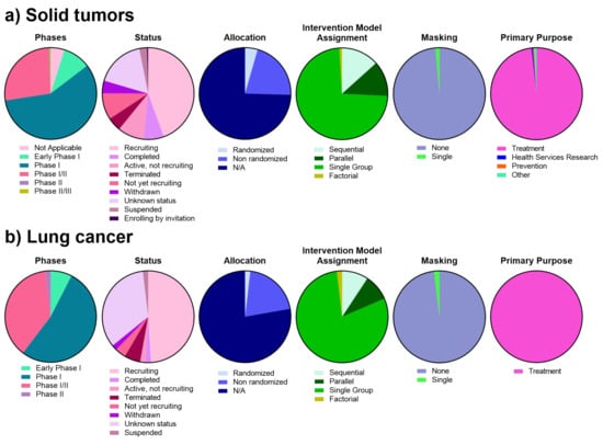 Categorization of CAR-T cell interventional clinical trials for lung cancer on phases, studied conditions, status, and study design (allocation, intervention model assignment, masking, and primary purpose). (a) Interventional clinical trials studying CAR-T for solid tumors. (b) Interventional clinical trials studying CAR-T for lung cancer.