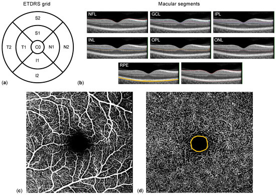 Macular spectral-domain OCT and OCTA were obtained using a SPECTRALIS® HRA+OCT (Heidelberg Engineering, Heidelberg, Germany). Corneal curvature values (c-curve) were recorded for all patients. Two consecutive examinations of sufficient image quality (quality score ≥ 20) were acquired. Macular OCT scans consisted of 25 single horizontal axial scans centered on the fovea. Individual retinal layer thicknesses were obtained after segmentation of the images using the manufacturer’s software: entire retinal thickness, nerve fiber layer (NFL), ganglion cell layer (GCL), inner plexiform layer (IPL), inner nuclear layer (INL), outer plexiform layer (OPL), outer nuclear layer (ONL), and retinal pigment epithelium (RPE) (Figure 1b). Results of the semi-automated segmentation were inspected separately by two experienced ophthalmologists (Y.C. and M.G.) and, if needed, corrected manually. Thickness results were divided into nine subfields using the Early Treatment Diabetic Retinopathy Study (ETDRS) 1, 2.22, 3.45 mm grid (Figure 1a). Thickness values of each subfield were exported using a software plug-in provided by Heidelberg Engineering (Heidelberg, Germany). Regarding OCTA, the superficial (SCP, extending from the internal limiting membrane to the IPL, Figure 1c) and deep capillary plexus (DCP, extending from the IPL to the OPL, Figure 1d) were acquired automatically. Their respective vessel density (VD) as well as the area of the foveal avascular zone at the DCP level (FAZ, in mm2, Figure 1d), were extracted and analyzed by Y.C. and M.G. using ImageJ (Wayne Rasband, version 1.52e) as described by Wang et al. [18].