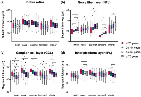 First, the thickness of macular segments and their ETDRS subfields were examined. To simplify analyses, subfields were averaged into quadrants, e.g., the inner nasal (N1) and outer nasal (N2) averaged into a nasal quadrant. Regarding the entire retinal thickness at the macula, using one-way ANOVA, there was no statistically significant thickness decrease overall. However, the quadrant thickness (nasal, superior, temporal, and inferior) was statistically significantly decreased between the four age subgroups (e.g., superior quadrant: <20 years: 344.1 ± 18.7 µm; 20–44 years: 342.4 ± 16.1 µm; 45–69 years: 337.0 ± 19.0 µm; ≥70 years: 336.8 ± 16.5 µm, Table 2 and Supplementary Table S1). The difference between each subgroup was small, thus the post hoc analysis returned no statistically significant results (Figure 2a). When looking at selected retinal segments, the analysis returned more differentiated results. For the NFL, ANOVA revealed statistical differences between age groups for all four quadrants. Additionally, post hoc analysis showed that NFL thickness increased continuously from the youngest subgroup to the oldest. The difference was statistically significant for many direct subgroup comparisons, particularly between either the <20 years or 20–44 years subgroup and the oldest subgroup (≥70 years) (Figure 2b). A difference between subgroups was also detected for GCL thickness, where the post hoc analysis of ANOVA was statistically significant when comparing the two youngest subgroups with the ≥70 years subgroup and comparing the <20 years with the 45–69 years subgroup (Figure 2c). Comparisons within the IPL thickness data showed statistical differences in the nasal, temporal, and inferior quadrants, but not in the superior. Regarding subgroup comparisons, the nasal IPL thickness in the oldest subgroup differed statistically from the youngest and the 20–44 years subgroups; in the inferior quadrant a statistical difference appeared between the 20–44 years and both the 45–69 years and the oldest subgroups (Figure 2d). Regarding the RPE thickness, the ANOVA identified statistically significant differences between the subgroups in all quadrants; in particular, the 20–44 years subgroup differed from the ≥70 years subgroup in all quadrants and both oldest subgroups were statistically different in the nasal and temporal segments. In general, the direct comparison between the <20 years and the 20–45 years subgroups never reached statistical significance; on the contrary, the oldest subgroup was the one differing most frequently from the others. Analyses of the other macular segments (INL, OPL, ONL) did not show any consistent difference between the age groups and therefore are not presented here.