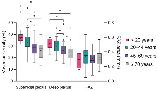 Comparison of OCTA parameters between age groups. The box plots represent the distribution of the vascular density of the superficial and deep plexus as well as of the foveal avascular zone (FAZ) area in all four age groups. Statistically different results in the analysis of variance are represented with an asterisk (*), the mean value is presented with a cross (+).