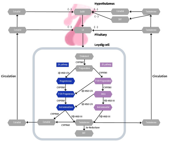 Steroidogenesis is the biosynthetic process of converting cholesterol into steroid hormones, including T [77]. Although they are synthesized mainly in the gonads, steroid hormones are also produced in the adrenal glands. In the adult testis, production of T in LCs is dependent on the pituitary gland’s pulsatile release of LH into the peripheral circulation. In LC steroidogenesis, LH have two important roles: maintaining appropriate levels of steroidogenic enzymes and mobilizing and transporting cholesterol to the inner mitochondrial membrane. LH induces adenosine triphosphate (ATP) conversion to cyclic adenosine monophosphate (cAMP), which then catalyzes the production of protein kinase A, which is required for the transfer of cholesterol from the cytoplasmic pool to mitochondria. The peripheral benzodiazepine receptor (PBR) and the steroidogenic acute regulatory protein (StAR) transport cholesterol from the outside to the inner mitochondrial membrane [78,79]. On the matrix side of the inner mitochondrial membrane, cholesterol is converted to pregnenolone by the C27 cholesterol side-chain cleavage cytochrome P450 enzyme (CYP11A1). Then, in the smooth endoplasmic reticulum, pregnenolone is transformed to T via three steroidogenic enzymes: 3-hydroxysteroid dehydrogenase (3β-HSD), 17-hydroxylase/17,20-lyase P450 (CYP17A1), and 17-hydroxysteroid dehydrogenase type III (17β-HSD III) [77,80,81,82]. T synthesis from cholesterol can take place through several pathways. Normal adult testicular steroidogenesis in humans follows the Δ5 pathway, with a little amount of testosterone generated via the Δ4 pathway [83]. However, in rodents, testicular steroidogenesis primarily follows the Δ4 pathway [84]. Cholesterol in the ∆5 pathway is converted using the following intermediates: pregnenolone, 17-OH-pregnenolone, dehydroepiandrosterone (DHEA), and androstenediol. In contrast, the ∆4 pathway uses androstenedione as the last precursor to T. Androstenedione can be created by the conversion of DHEA as well as pregnenolone to progesterone and then to 17-OH-progesterone [85]. Small amounts of T or androstenedione are converted to estrogens in the testis by aromatase (CYP19A1). Figure 2 presents a schematic diagram of regulatory axis of testicular steroidogenesis.