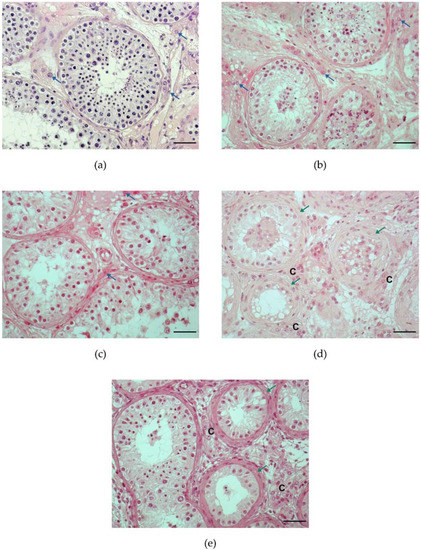 - Volkmann, J.; Muller, D.; Feuerstacke, C.; Kliesch, S.; Bergmann, M.; Mühlfeld, C.; Middendorff, R. Disturbed spermatogenesis associated with thickened lamina propria of seminiferous tubules is not caused by dedifferentiation of myofibroblasts. Hum. Reprod. 2011, 26, 1450–1461. [Google Scholar] [CrossRef]