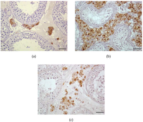 Immunohistochemical staining against insulin-like factor 3 in the mature Leydig cells in testicular biopsies from azoospermic men with different histological patterns. Insulin-like factor 3 expression at protein level is visible as a brown color in Leydig cell cytoplasm (used chromogen: diaminobenzidine—DAB); (a) complete spermatogenesis with normal Leydig cells number; (b) Sertoli cell only syndrome with exceedingly large Leydig cell hyperplasia; (c) mixed atrophy and increased Leydig cell number in the intertubular space. Magnification ×200; scale bar, 50 µm.