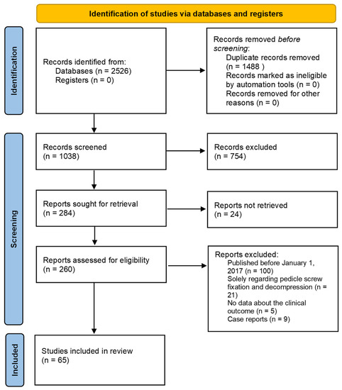 We obtained a review of the most updated evidence of the current palliative management of spinal metastases through a systematic and extensive literature search strategy according to PRISMA guidelines (Figure 1). The initial database queries yielded 2526 articles, of which 1488 were duplicates. The remaining 1038 unique records were manually screened and 754 were excluded since they did not meet our inclusion criteria. Among the remaining articles, 24 more articles were excluded due to the lack of full-text. Subsequently, 260 articles were assessed for eligibility and 160 more studies were excluded because according to our exclusion criteria. In particular, 100 articles published before January 2017, 21 studies regarding only vertebral fixation and decompression, 5 studies with no sufficient data about clinical outcome, and 9 case reports were excluded. Finally, through our comprehensive search and screening strategy 65 studies were included in this systematic review.