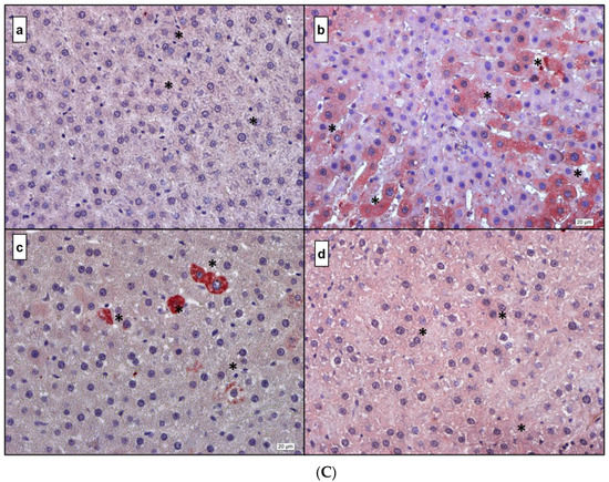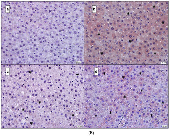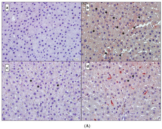 After incubation at 56 °C for 12 h, sections were deparaffinized in xylene and the rehydration process was applied through a descending series of alcohol to water. Antigen retrieval was performed by incubation of the sample in 10% citrate buffer (pH 6.0) at 250 °C for 6 min, with subsequent cooling to room temperature for 30 min. Then, tissue sections on slides were marked with a hydrophobic pen and rinsed in phosphate-buffered saline (PBS) with 5% Tween. For protein blocking and non-specific binding, the sections were incubated in 3% H2O2 for 20 min in dark. After rinsing in phosphate-buffered saline (PBS) the Anti-Polyvalent HRP Kit (Invitrogen, Waltham, MA, USA) was used for the following steps. To reduce non-specific staining, sections were pretreated with the blocking solution for 20 min in a humidity chamber. After removing the blocking solution, slides were covered with primary antibodies used against IL-1β (Santa Cruz, CA, USA), IL-6 (Abnova, Taiwan), TNF-α (Novus Biologicals, Centennial, CO, USA), and NF-κB (Santa-Cruz, CA, USA). Primary antibodies were directly applied on the sections and the slides were incubated overnight at 4 °C in a humidified chamber. The negative control was incubated with a blocking solution without the primary antibody. After washing (3 × 5 min) in PBS-Tween, sections were incubated with HRP-Streptavidin for 20 min in a humidified chamber and washed with PBS-Tween (3 × 5 min). Freshly prepared AEC (Aminoethyl Carbazole, Invitrogen, Waltham, MA, USA) was applied as a chromogen for 8–15 min at room temperature. After the reaction was stopped by washing with deionized water, sections were counterstained with hematoxylin and washed under dripping water for 10–15 min for developing purple color. Finally, sections were covered with a fixative, aqueous mounting solution (Bio-optica), and the stained sections were examined for IL-1β, IL-6, TNF-α, and NF-κB with a BX53 Olympus Camera (DP72 Olympus Software, Ver. 5174). Immunoreactivity for the reference inflammation markers was scored by counting the number of positively stained cell nuclei and expressing this as a percentage of the total number of cell nuclei counted.