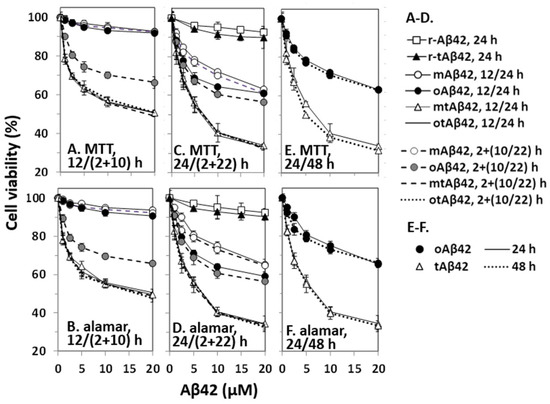 Cytotoxicity of Aβ42 and tAβ42. HeLa cells were treated with mAβ42, oAβ42, mtAβ42, and otAβ42 at the indicated concentrations for 12/(2 + 10) h (A,B), 24/(2 + 22) h (C,D) and 24/48 h (E,F). After treatment, cell viability was assessed with the MTT reduction assay and alamarBlue assay. Results are expressed as the mean ± standard deviation of values from three independent experiments. Data for Aβ42 12 h, mAβ42 2 + 10 h and oAβ42 12 h in A and B; mtAβ42 12 h, mtAβ42 2 + 10 h, otAβ42 12 h and otAβ42 2 + 10 h in A and B; mtAβ42 24 h, mtAβ42 2 + 22 h, otAβ42 24 h and otAβ42 2 + 22 h in C and D are overlapped.