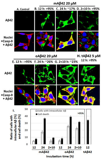 Next, we counted cells conveying Aβ peptide intracellularly after treatment with each peptide preparation, using a confocal microscope. If cells intracellularly accumulate the peptide that was added extracellularly, it means that it means that the peptide entered the cells, possibly indicating the cell permeability of the peptide [15]. For samples treated for 12 h with 20 μM mAβ42 and oAβ42, ~5% of cells contained the peptide (see Figure 2B,E for representative images showing cells without the peptides inside and Figure 2I for summary). Longer incubation of the cells for 24 h with the peptide resulted in more cells conveying the peptide (~17% for mAβ42 and ~26% for oAβ42) (Figure 2C,F,I). The samples treated twice with oAβ42 for 2 h and subsequently for 10 h, which showed high levels of cell death (Figure 1), showed higher levels of internalization of the peptide (~23%, Figure 2G) than those treated with oAβ42 for 12 h (Figure 2E) and 2 + 10 h samples treated with mAβ42 (Figure 2D). This implied that the double treatment with the oligomeric preparations increased the permeability of the peptide (see Figure 2I for summary). On the other hand, >95% of cells treated with 5 µM tAβ42 for 12 h, which showed a similar level of cell death as those treated with 20 µM oAβ42, intracellularly contained the peptide (Figure 2H,I). It was expected that more cells became dead with the high level of intracellular location of tAβ42. We speculate that a certain level of intracellular accumulation of the peptide is necessary to induce cell death because the higher concentrations of the peptide showed stronger cytotoxicity (Figure 1) even with a similar level of intracellular peptide (data not shown). Samples incubated for longer times, such as 48 h and 2 + 22 h, are not shown here, because the images of those samples were not clear, probably due to cell debris. In summary, the intracellular levels of Aβ peptides in the cells roughly correlated with the cytotoxicity of the different preparations (Figure 2I). It is noteworthy that tAβ42 appeared to interact with caspase-9, similar to wild-type Aβ [26], as shown in the confocal assay (see the yellowish color of the overlapping image in Figure 1H).