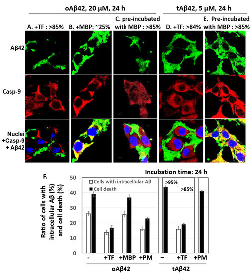 Effects of taiwaniaflavone and MBP on cellular internalization of Aβ42 and tAβ42. (A–E) HeLa cells were treated with 20 µM oAβ42 or 5 µM tAβ42 for 24 h in the presence of either 10 µM taiwaniaflavone or 0.4 µM MBP (Figure 3), and the confocal microscopic images of the cells were taken for Aβ and caspase-9 by applying mouse anti-Aβ (6E10) and rabbit anti-caspase-9 (p10) antibodies. Aβ (green) and caspase-9 (red) were visualized using the secondary antibodies indicated in the Section 2. The pre-incubation was performed as shown in Figure 3. Images for Aβ peptides located extracellularly are shown in (A,C,D), while those for intracellular peptides are in B and E. The numbers on the upper side of the figures indicate percentages of cells having Aβ peptide extra- or intracellularly as shown in the images. At least three independent experiments were carried out, and only representative images of the cells are displayed. (F) Summary of the comparison of the number of cells with intracellular Aβ and cell death. The number of cells with intracellular Aβ was calculated using the results from Figure 4 and data for cell death were from Figure 3. Data are presented as the mean ± standard deviation of values from three independent experiments. TF and PM stand for taiwaniaflavone and pre-incubation with MBP, respectively.