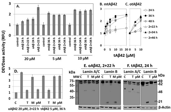 We determined whether the cell-permeable tAβ42 is able to induce the same cytotoxic process as the wild-type peptide. Otherwise, the highly toxic property of the peptide may be due to other cytotoxic pathways than the intracellular location. Previously, we showed that the oligomerization process and double treatment, which are necessary for the high level of cytotoxicity and internalization of wild-type Aβ42 into the cells (Figure 1 and Figure 2), are essential for inducing apoptotic caspase activation, a hallmark process of caspase-dependent apoptosis [39,40,41], and Aβ-specific lamin protein fragmentation [29]. Thus, to examine whether tAβ42 can induce the same cytotoxic process as the wild-type Aβ peptide, caspase-3/7-like DEVDase activation and lamin fragmentation were explored in the fusion peptide-treated cells.