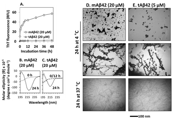 Physical characterization of tAβ42. (A) Fibrillogenesis of tAβ42 and mAβ42 was monitored by measuring ThT fluorescence of the peptide at the indicated incubation time at 37 °C. RFU stands for relative fluorescence unit. (B,C) CD spectra were recorded for freshly prepared sample (solid line), 12 h-incubated (broken line overlapped with that of freshly prepared sample; shown only for tAβ42), and 24 h (dotted line)-incubated samples of mAβ42 and tAβ42. (D,E) mAβ42 and tAβ42 peptides were incubated under the indicated conditions and images were captured using TEM at a magnification of 40,000× tAβ42 samples contained low levels of polymerized species (see the results). The parts of TEM images were presented to show the conformational species clearly. These are representative ones obtained from at least three independent experiments. Scale bars are shown beneath the TEM images.
