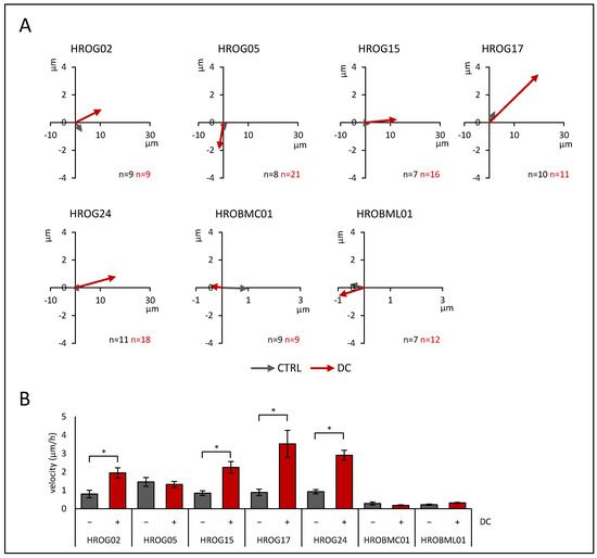 In initial experiments, five patient-derived low-passage glioblastoma cell lines and two cell lines derived from brain metastases were tested for their migratory behavior in the direct current (DC) electrical field. As illustrated by the gray sum vectors in Figure 1A, all cell lines presented a migratory phenotype even in the absence of an electrical field (referred to as control (CTRL); see Supplementary Figures S2–S5 for single cell data). However, when the cells were exposed to DC electrical fields, glioblastoma cell lines HROG02 (CTRL: 0.79 ± 0.21 µm/h vs. DC: 1.94 ± 0.28 µm/h), HROG15 (CTRL: 0.84 ± 0.13 µm/h vs. DC: 2.25 ± 0.32 µm/h), HROG17 (CTRL: 0.88 ± 0.18 µm/h vs. DC: 3.5 ± 0.74 µm/h), and HROG24 (CTRL: 0.92 ± 0.11 µm/h vs. DC: 2.91 ± 0.27 µm/h) showed significantly enhanced migration velocities (p < 0.05 for all, U test; Figure 1B). In contrast, HROG05 (CTRL: 1.45 ± 0.24 µm/h vs. DC: 1.32 ± 0.15 µm/h) and both metastases cell lines HROBMC01 (CTRL: 0.28 ± 0.08 µm/h vs. DC: 0.18 ± 0.03 µm/h) and HROBML01 (CTRL: 0.22 ± 0.03 µm/h vs. DC: 0.31 ± 0.03 µm/h) were unaffected by the DC electrical field.