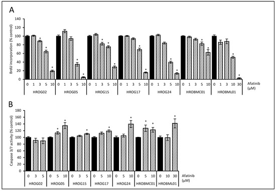 Effects of the EGF receptor inhibitor afatinib on cell proliferation and apoptosis. (A) Glioblastoma cells (HROG02, HROG05, HROG15, HROG17, and HROG24) and brain metastasis cell (HROBMC01 and HROBML01) growing in 96-well half-area microplates were treated with afatinib (striated bars) or solvent (black bars) for 48 h, before DNA synthesis was assessed with the BrdU incorporation assay. One hundred percent BrdU incorporation corresponds to cells cultured with solvent only. Data are presented as mean ± SEM (n ≥ 18 separate cultures); * p < 0.05 versus control cultures (Kruskal–Wallis test with post hoc Dunn’s test). (B) Subconfluent-growing glioblastoma cells were challenged with afatinib (striated bars) or solvent control (black bars) for 6 h followed by caspase 3/7 enzyme activity quantification. Data are presented as mean ± SEM (n ≥ 9 separate cultures for caspase activity assay); * p < 0.05 versus control cultures (Kruskal–Wallis test with post hoc Dunn’s test).