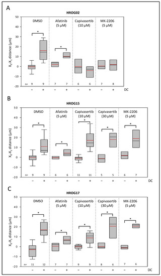 Effects of AKT inhibitors and afatinib on galvanotactic migration of (A) HROG02, (B) HROG15, and (C) HROG17. Glioblastoma cells growing on coverslips were treated with afatinib, capivasertib, MK-2206, or solvent (DMSO) at the indicated doses. Median is shown as a black colored line and the mean as a red line. Data are based on 5–12 independent biological replicates (in each replicate migration of up to 40 cells was analyzed), * p < 0.05 versus control cultures w/o DC (Mann–Whitney U test).