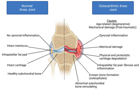 The development and progression of osteoarthritis (OA) are also negatively affected by epigenetic dysregulation. OA is a debilitating joint disease and instigator of chronic disability that affects approximately half of the global population over the age of 65, incurring a substantial socioeconomic burden (USD 128 billion in 2003 alone and rising) [13,14,15,16]. The prevalence of this disease is expected to continue to grow as global life expectancies rise [17]. OA pathophysiology is most associated with synovitis (chronic synovial inflammation), ectopic new bone formation (osteophytes), abnormal subchondral bone remodeling, and the degradation of articular cartilage due to physical and proteolytic degradation [18,19,20] (Figure 1). However, OA is a multifactorial disease that also affects the meniscus, ligament structures, and infrapatellar fat pad, meaning that it is a whole joint disease [21,22]. Known risk factors for the disease include microenvironment and mechanical stressors, physical activity levels, health status, obesity, genetic predisposition, and age [23,24,25]. One of the biggest difficulties in the understanding and treatment of the disease is that OA is symptomatic only in approximately 30% of patients in later disease stages, making the detection of early biomarkers difficult [26,27]. At present, no disease-modifying drugs are available to decelerate or reverse OA. Current OA treatments are limited to pharmacological pain management and arthroplasty, an irreversible surgical procedure that typically requires revisional surgery in 10–15 years [28,29].