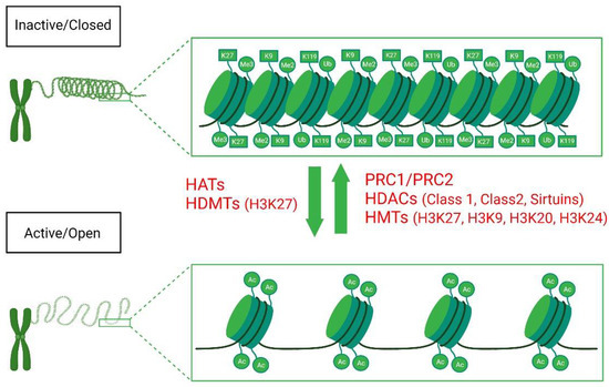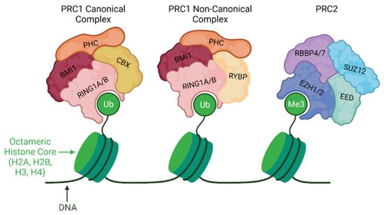 Polycomb repressive complexes (PRCs) are key enzymes for regulating and modifying chromatin structure and histones. Polycomb repressive complex 1 (PRC1) and Polycomb repressive complex 2 (PRC2) are the two main repressive PcG protein complexes that contribute to chromatin compaction and play a crucial role during development, cell proliferation, and differentiation (Figure 3) [116,117]. PRCs are important in the silencing of genes globally, particularly during mitotic cycles that can act as regulatory mechanisms. Additionally, PRC proteins are biologically essential throughout development from embryogenesis to adulthood, particularly in the regulation of imprinted genes [118,119,120].