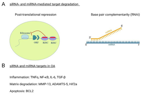 siRNAs are double stranded, non-coding RNAs approximately 21–23 nucleotides in length (Figure 4) that typically have one specific target [151]. siRNAs are known to protect the genome from exogenous or invasive nucleic acids, such as viruses and transposons [152]. siRNAs can induce target degradation after translation through the formation of an RNA-induced silencing complex (RISC) or directly target mRNAs for degradation through base pair complementarity (RNAi) [152,153]. The role of siRNAs in the onset and development of OA is ever expanding. Given that OA is a polygenic disease, researchers typically focus the siRNA discovery of chondrocytes, cartilage, and synovium on one aspect, such as chronic inflammation or matrix degradation. For instance, the siRNA-mediated knockdown of ADAMTS-5 and MMP-13 through intra-articular injection ameliorated cartilage damage and inflammation following DMM in mice [154,155]. Similar findings were reported when siRNA targeting MMP-13 were delivered using intra-articular nanoparticle delivery methods [156]. RNA-silencing was also found to be effective at inhibiting inflammation through the targeting of TNFα and Transforming growth factorβ-activated kinase-1 (TAK1) in a collagen-induced murine models [157]. These findings demonstrate the efficacy of siRNA-mediated targeting strategies in the treatment of OA, but further work is needed to validate these findings in human joints. Meanwhile, other key targets for siRNA-mediated inhibition include the NF-κB and transforming growth factor-beta (TGF-β) pathways (inflammation), SOST (subchondral bone remodeling), hypoxia-induced factor 2a (Hif2a) (cartilage degeneration and synovitis), MMP13 (matrix catabolism) and mitochondrial dysfunction, which results in cell apoptosis [158,159,160].