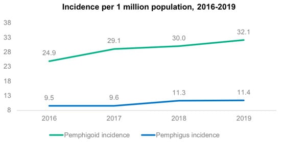 From 1 January 2016 to 31 December 2019, a total of 15,020,373 admissions were recorded in the MBDS database. Of these, 1950 were diagnosed with some type of pemphigus and 5424 with some type of pemphigoid. Thus, total incidence was, for pemphigus, 13.0 per 100,000 admissions and 10.4 per 1 million population; and for pemphigoid, 36.1 per 100,000 admissions and 29.0 per 1 million population. Incidence increased for both diseases over the study period Figure 1 and Figure 2.