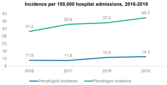 Annual incidence (2016–2019) of pemphigus and pemphigoid per 100,000 hospital admissions.