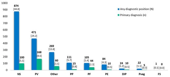 Number of cases by pemphigus subtype and relative importance of diagnosis for the admission (primary versus secondary/other diagnosis). DIP: Drug-induced pemphigus; FS: Fogo selvagem; PE: Pemphigus erythematosus; PF: Pemphigus foliaceus; PP: Paraneoplastic pemphigus; PV: Pemphigus vulgaris; Pveg: Pemphigus vegetans; NS: Pemphigus, not specified. Some patients have >1 pemphigus diagnosis. Number (%) of cases by total of pemphigus.