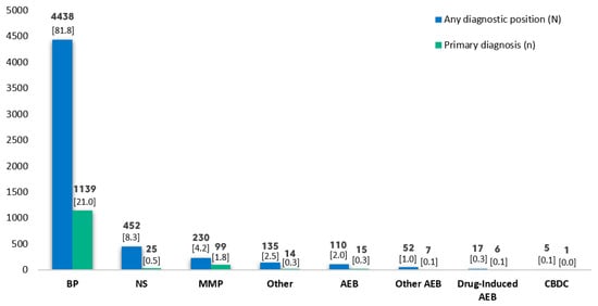 Notwithstanding this emerging evidence, the literature has scarce data about the relationship between ABDs and some diseases, such as that between pemphigus and neuropsychiatric diseases [,]. In addition, most published studies are in patients seen in ambulatory care, whereas few studies analyze the comorbidities of patients with ABD on a hospital basis. In Spain, there is a hospital discharge database, known as the Minimum Basic Data Set (MBDS) [], which provides information on all hospital admissions and their associated diagnoses, including skin pathologies.