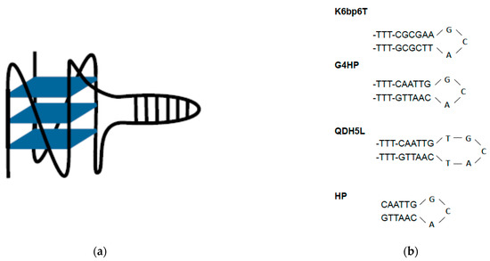 (a) Schematic representation of the QDH structures studied in this work; (b) the stem-loops of K6bb6T, G4HP, and QDH5L and the hairpin HP.