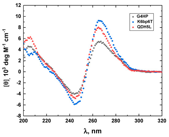 To ensure that the mutations introduced to K6bp6T do not change the topology of the G-quadruplex core or the orientation of the stem-loop in the modified QDH structures (G4HP and QDH5L), we compared the CD spectra of G4HP and QDH5L with the spectrum of K6bp6T [22]. Figure 2 shows the three CD spectra; the similarity of the overall shapes of the spectra testifies to the fact that the mutations did not alter the topology of the QDH structures. The differences in the amplitude of the CD bands between G4HP, QDH5L, and K6bp6T may be related to the differential nearest neighbor interactions between the bases of the stem loops.