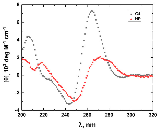The CD spectra of the G4 G-quadruplex (black) and the HP hairpin (red).