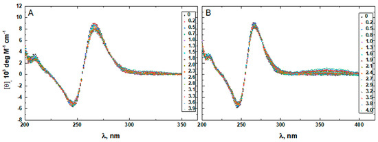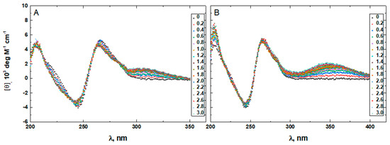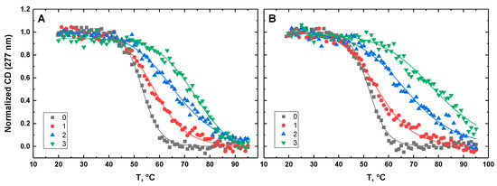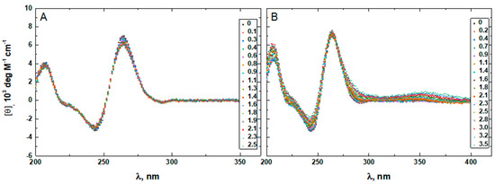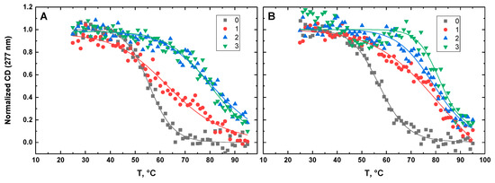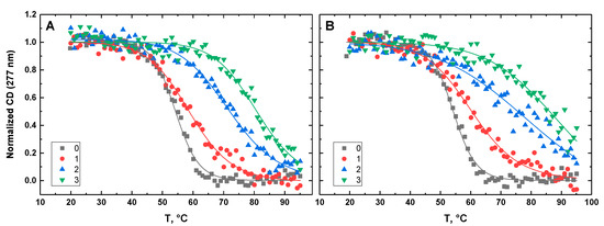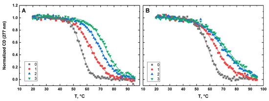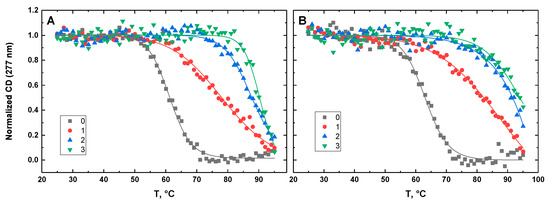 Figure 10, Figure 11, Figure 12, Figure 13 and Figure 14 show the CD-detected melting profiles of G4HP, QDH5L, HP, K6bp6T, and G4, respectively, at drug-to-DNA ratios from 0 to 3. In each figure, panel A presents melting profiles in the presence of netropsin, while panel B shows the thermal data in the presence of Hoechst 33258. Inspection of Figure 10, Figure 11, Figure 12, Figure 13 and Figure 14 reveals that the binding of either drug to each DNA structure studied here results in its stabilization, as can be judged by significant increases in TM at increasing drug-to-DNA ratios.