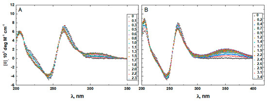 The CD spectra of G4HP, QDH5L, and HP depicted in Figure 4, Figure 5 and Figure 6 exhibit characteristic binding-induced bands at ~315 (panel A) and ~350 (panel B) nm, which are the CD spectroscopic signatures of the association of duplex DNA with netropsin and Hoechst 33258, respectively [35,36]. Thus, both netropsin and Hoechst 33258 bind to the all-AT binding sites of the stem-loops of the G4HP and QDH5L G-quadruplex–duplex hybrids and the hairpin HP. In contrast, the CD spectra of K6bp6T and G4, shown in Figure 7 and Figure 8, either lack or exhibit very weak CD bands above 300 nm. This observation suggests that the two minor groove binders do not bind, or bind only weakly, to the minor groove of a duplex; this is an expected result, given that the G-quadruplex (G4) lacks the duplex portion, while the stem-loop of K6bp6T does not contain the cognate all-AT binding site.
