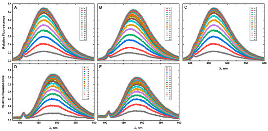 Figure 9 presents the fluorescence spectra of G4HP (panel A), QDH5L (panel B), HP (panel C), K6bp6T (panel D), and G4 (panel E) in the absence and presence of Hoechst 33258. The drug-dependent spectral variations shown in Figure 9A–E suggest strong binding of Hoechst 33258 to all DNA structures studied here. This result agrees with the results of previous studies that reported the association of minor groove-binding drugs with G-quadruplex structures [37,38,39,40,41,42].