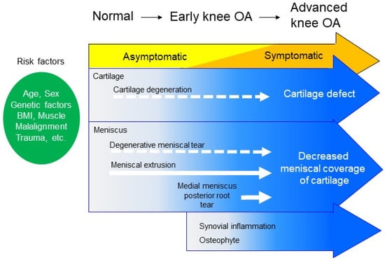Scheme of knee osteoarthritis (OA) progression. In knee OA, cartilage degeneration progresses gradually based on several risk factors, including age, sex, genetic factors, bone mass index, muscle, alignment, and trauma [6]. Knee symptoms gradually progress with repeated improvement and exacerbation, and early knee OA progresses to advanced knee OA. Degenerative meniscal tears, which are typically observed in elderly people, also progress gradually, but they do not substantially affect the prognosis of OA. By contrast, meniscal extrusion, especially when followed by a medial meniscus posterior root tear, is a critical factor for the initiation/progression of knee OA, as it results in decreased meniscus coverage of the cartilage [16]. This is a quite different pathology from a simple degenerative meniscal tear [17]. Along with OA progression, synovial inflammation and osteophyte formation are commonly observed. OA; osteoarthritis; BMI; body mass index.