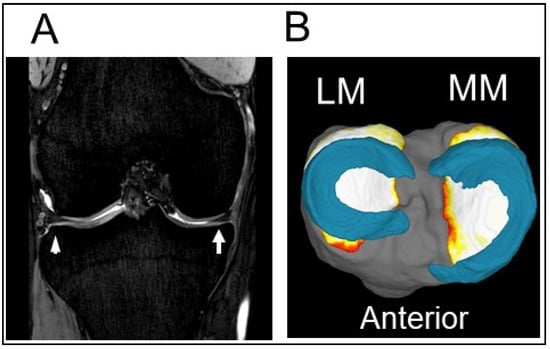 Morphological tear patterns of the meniscus can include longitudinal, radial, horizontal, and flap tears [14]. MRI is a useful method for the evaluation of meniscus (Figure 2) and has a diagnostic accuracy value of up to 90% [23,24,25]. From the viewpoint of the hoop function of the meniscus, radial tears that transect the meniscus from the inner free edge to the periphery result in substantial loss of the load distribution [26]. Similarly, posterior root tears severely affect the biomechanics of the knee joint. A lateral meniscus (LM) posterior root tear is often accompanied by an acute ACL injury [27,28], while a medial meniscus posterior root tear (MMPRT) typically occurs in middle-aged and elderly patients, appearing as acute severe pain after a minor trauma, such as stumbling in a step. An MMPRT dramatically increases the contact pressure on the medial tibial plateau in a manner equivalent to a complete meniscectomy [29] and may induce subchondral insufficiency fractures or bone marrow edema [30,31]. This pathology has been recognized as a strong risk factor for the progression of knee OA, as discussed in a later section.