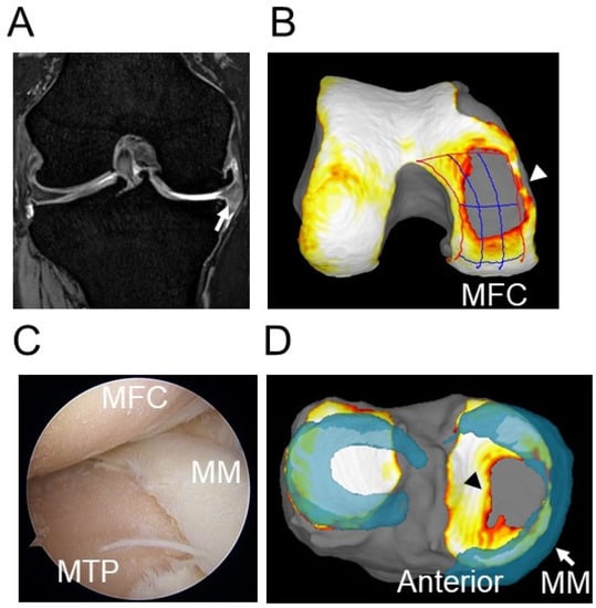 An extruded medial meniscus in the right knee. (A) Medial meniscal extrusion was confirmed in a coronal view (white arrow). Cartilage defects were observed in the medial compartment. (B) The 3D MRI view shows the cartilage defect in the MFC (white arrowhead). (C) Arthroscopic findings indicate decreased meniscal coverage of the MTP and cartilage defects in the MFC and the MTP. (D) The 3D MRI view shows extrusion of the MM (white arrow) and a cartilage defect in the MTP (black arrowhead). MM, medial meniscus; LM, lateral meniscus; MFC, medial femoral condyle; MTP, medial tibial plateau.