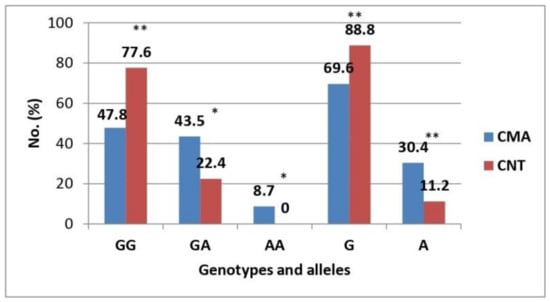 For children who live in urban areas, there was a significantly higher rate of the GG genotype of the IL-13 R130Q locus polymorphism in the CNT group of healthy children compared to the CMA group (75.5% vs. 46.7%, p < 0.05) (Table 2). There was a significantly higher rate of the GA genotype of the IL-13 R130Q locus polymorphism in urban children with CMA compared to healthy controls who live in urban areas (53.3% vs. 24.5%, p < 0.05).