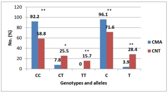Analysis of molecular genetic testing of CC, CT, and TT genotypes of the IL-4 T589C single nucleotide polymorphism showed a significantly higher rate of the CC genotype of the IL-4 T589C locus polymorphism in the CMA group compared to healthy controls (92.2% vs. 58.8%, p < 0.01) (Table 1, Figure 2). Significantly higher rates of CT and TT genotypes of the IL-4 T589C locus polymorphism were found in healthy controls compared to the CMA group (CT: 25.5% vs. 7.8%, p < 0.05; TT: 15.7% vs. 0%, p < 0.01).