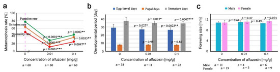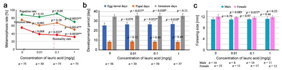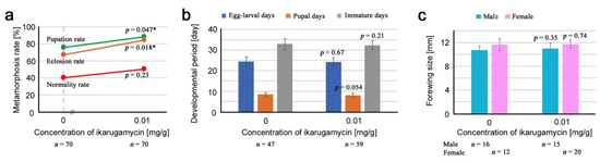| Number of eclosion (Eclosion rate) | 56 (74.7%) | 30 (60.0%) | 50 (66.7%) | 37 (49.3%) |