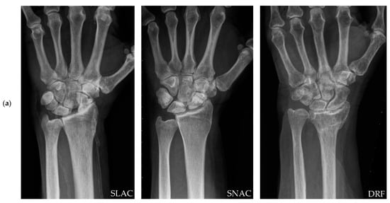 All patients who underwent TWA between July 2007 and October 2019 were retrospectively reviewed from our database. At our institution, stage three OA according to the Kellgren–Lawrence classification was a prerequisite for total wrist joint replacement []. Posttraumatic indications for TWA were included in the present study, i.e., SLAC wrists, SNAC wrists, and DRFs leading to wrist OA (Figure 1a). Only patients with a minimum postoperative follow-up period of more than 1 year were included. Moreover, pre- and postoperative clinical as well as radiographic parameters (see Section 2.1) had to be available.