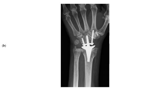 - Froschauer, S.M.; Zaussinger, M.; Hager, D.; Behawy, M.; Kwasny, O.; Duscher, D. Re-motion total wrist arthroplasty: 39 non-rheumatoid cases with a mean follow-up of 7 years. J. Hand Surg. Eur. Vol. 2019, 44, 946–950. [Google Scholar] [CrossRef]