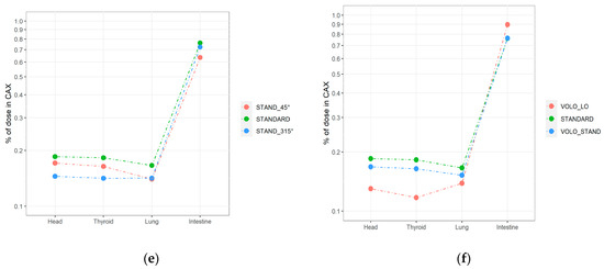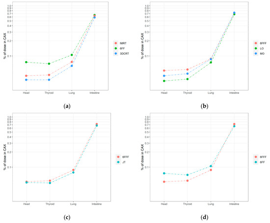 For the intestine, the highest value (% CAX dose) was obtained with the low beam modulation VOLO plan (plan 12; 0.90%), followed by high and intermediate modulated FFF plans (plans 1 and 3, respectively) and most CyberKnife plans (plans 8, 10–11). For the remaining plans, the % doses were <0.68%, with the lowest value for 3DCRT (0.59%).
