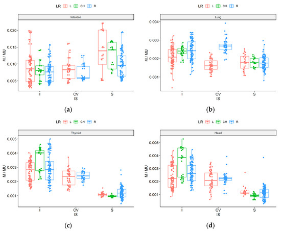 M/MU parameter for CyberKnife standard plan (8) for each of the 159 beams measured outside the target volume according to beam direction: left side (red), right side (blue), middle (green), and cranial (I), caudal (S), center (CV) for intestine (a), right lung (b), thyroid (c), and head (d).