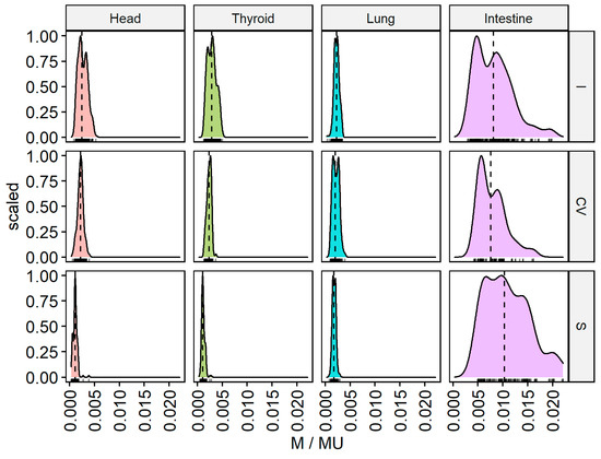 These measurements are presented as function densities and frequency histograms for a given measurement value (M/MU), as shown in Figure 4. For the intestine, the cranial (I) and caudal (S) beams form the flattest distribution curves (wide dose range but small frequency range). Areas located far from the target volume show narrow individual peaks for the head and thyroid from the caudal direction (S), indicating low dose levels in a narrow range, in contrast to the direction of entry of the beam from the cranial directions (I). The double peaks in the histograms may be attributable to scattered doses from the linac head. Double peaks are also visible for the right lung for the central position of the gantry (CV). By measuring each individual beam, it is possible to empirically differentiate the effect of low doses scattered within the phantom itself from low doses attributable to gantry head scattering.