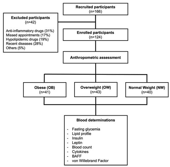 A total of 166 subjects were recruited to participate in the present study. Only 124 subjects met the inclusion criteria and attended their medical appointments, so they were included and classified according to their BMI: obese (OB, n = 41), overweight (OW, n = 43), or normal-weight (NW, n = 40) subjects, as shown in Figure 1.