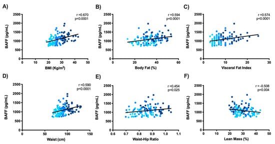 BAFF increases with body adiposity: Spearman correlation between BAFF and (A) BMI, and (C) visceral fat. Pearson correlation between BAFF and (B) body fat percentage, (D) waist circumference, (E) waist–hip ratio, and (F) lean mass percentage (n = 124).