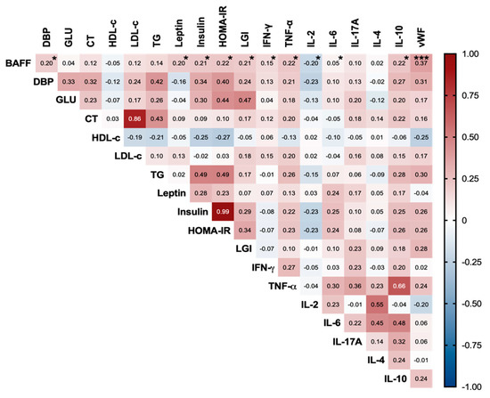 BAFF increases related to hyperinsulinemia, insulin resistance, and endothelial dysfunction. Correlogram of metabolic, inflammatory, and endothelial dysfunction markers related to obesity. Pearson and Spearman correlations are shown according to variable distribution (n = 124). BAFF significant correlations are denoted as * p < 0.05 and *** p < 0.001. BAFF: B-cell activating factor, DBP: diastolic blood pressure, Glu: glucose, CT: total cholesterol, HDL-c: high-density lipoprotein cholesterol, LDL-c: low-density lipoprotein cholesterol, TG: triglycerides, HOMA-IR: homeostatic model assessment, LGI: leucoglycemic index, IFN-γ: interferon gamma, TNF-α: tumor necrosis factor alpha, IL: interleukin, vWF: von Willebrand factor.