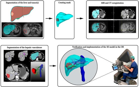 Segmentation of preoperative CT and/or MR imaging scans and subsequent generated virtual reality 3D models may provide a clear visualization of the liver parenchyma, tumors, vital anatomical structures, and the relation of the tumor(s) to these vital structures. The applicability of 3D models was already described as early as 2010 in open liver surgery for preoperative planning of liver resection and living donor transplantation [10,11,12,13].